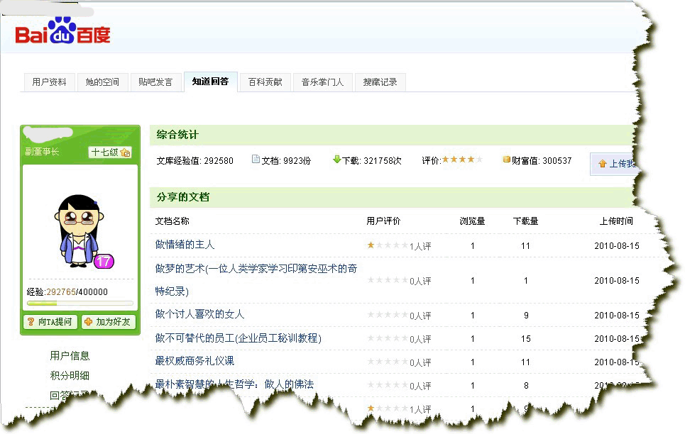 “文檔分享”所獲取的經(jīng)驗值和財富值會計入知道的總經(jīng)驗值和總財富值中。